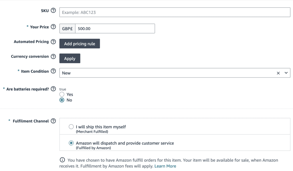 - Fulfilment Channel (Amazon will dispatch and provide customer service)