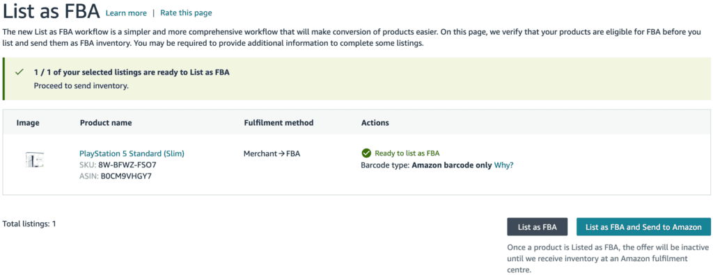 6. To complete the process, click on either the “List as FBA” button if you want to add the item to your inventory now but plan to send it in later. Alternatively, you can click the “List as FBA and Send to Amazon” button if you intend to send the item immediately and want to create a shipment.